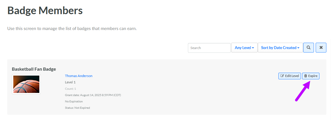 Note: You can also expire a Badge from the Members tab of the Badge Details screen. See Expire a Badge for more information on that process.