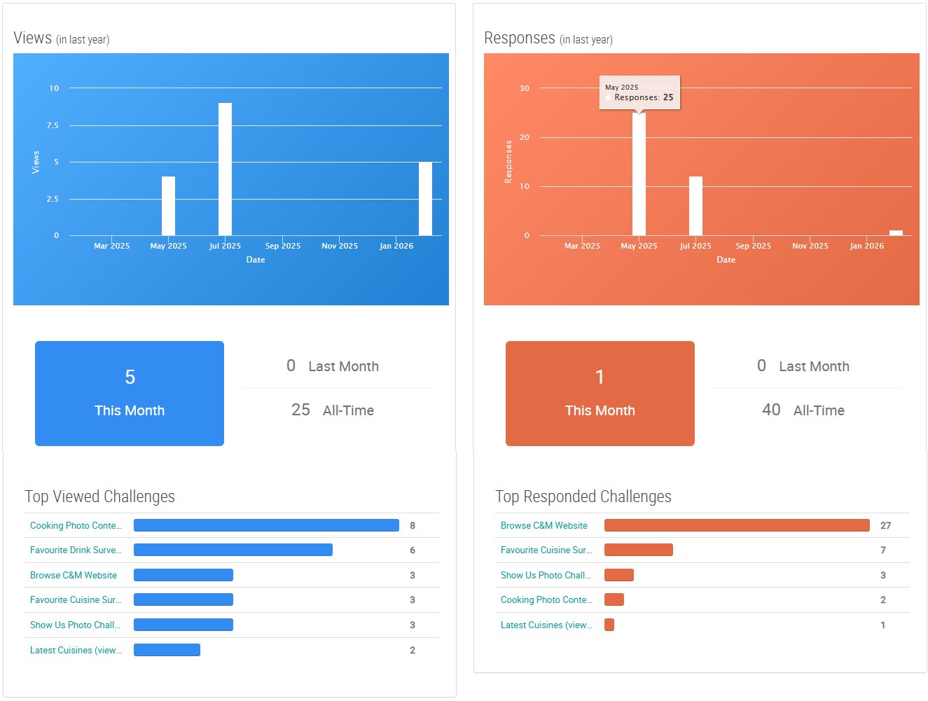 For Responses, the Dashboard displays a bar graph depicting the number of Challenge Responses created (across all Challenges) per month, over the last year. Beneath this bar graph, the Dashboard displays the number of Challenge Responses created this month, last month, and all-time. Beneath these KPIs, the Dashboard lists the top-completed Challenges, and the number of Responses each of them generated.