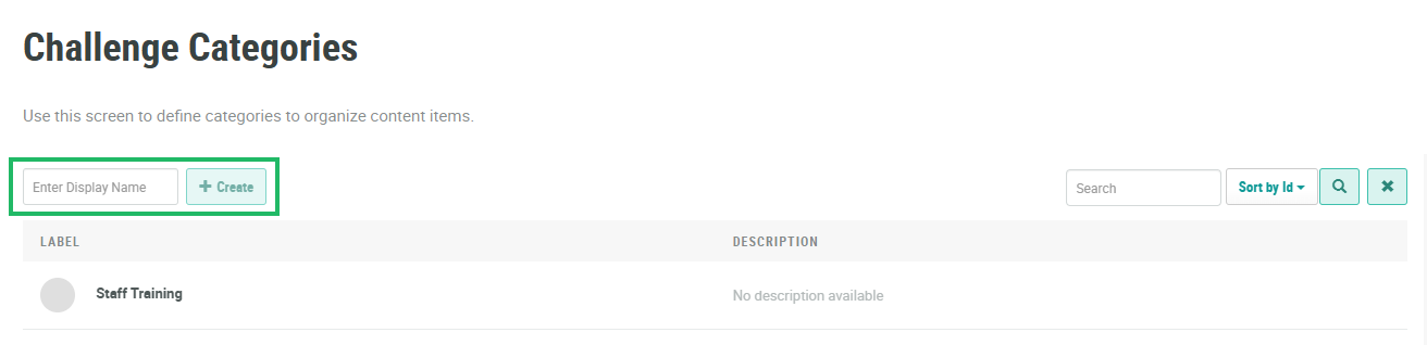 Select Challenges from the top navigation bar, then select Settings > Challenge Categories from the side navigation menu. The Challenge Categories screen is displayed.