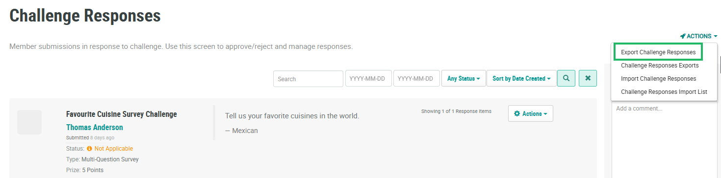 Select Challenges from the top navigation bar, then select Challenges > Challenge Responses from the side navigation menu. The Challenge Responses screen is displayed.