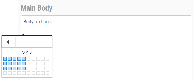 The option to insert a table into a text field is available only from the expanded tool bar (described above). The expanded tool bar is available within the Body field, only if the Body field has been configured as “Main Body” within the Template Set.