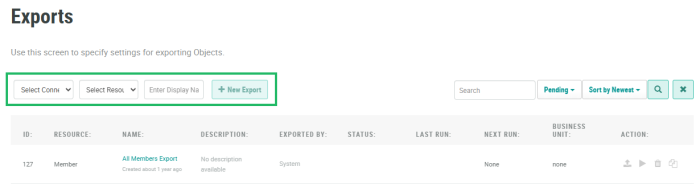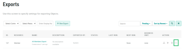 2. On the Exports screen, search for the desired Export Definition (see Search for an Export Definition for more information).