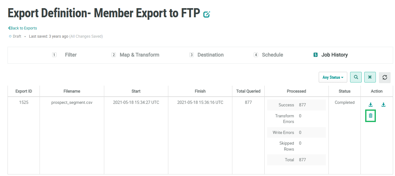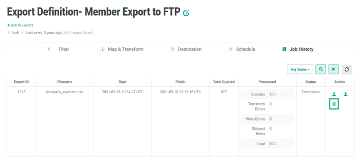 The platform maintains a log of every Export Definition job execution. To delete a past export job: