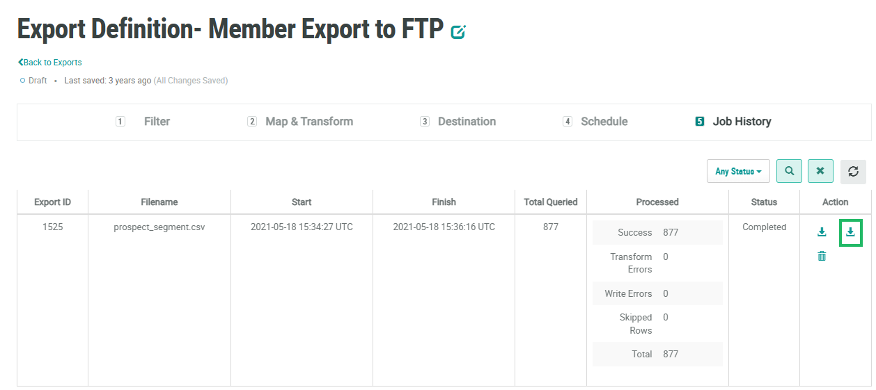 The platform maintains a log of every Export Definition job execution. To download the logs for a past job: