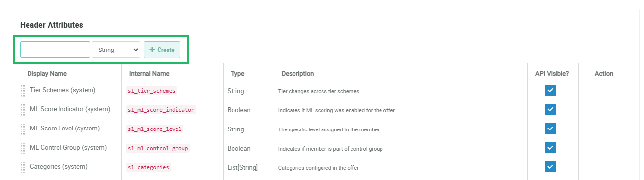 Note: Each Activity Type (including both user-defined and default system Activity Types) includes a set of pre-defined System Attributes that can't be edited or deleted. These System Attributes include important data needed by the Loyalty platform to process the Activity, such as the date / time, changes in Metric accrual, and the Member ID. These System Attributes are hidden by default, but you can view them by clicking the Show System Attributes link within the Header Attributes section.