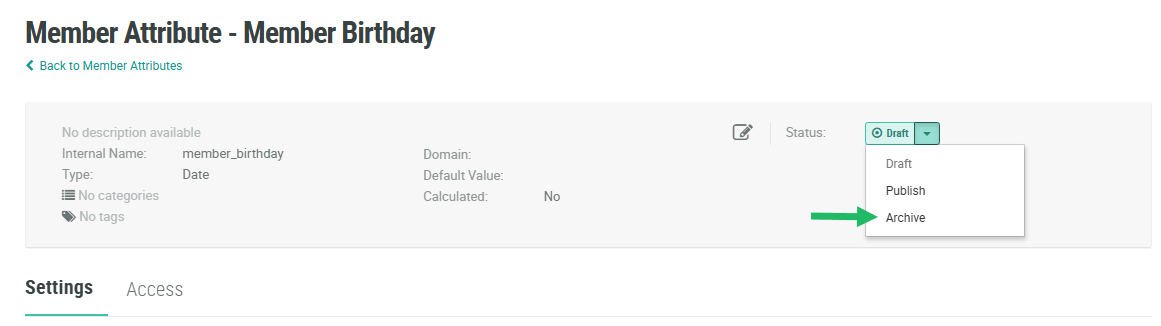 Archiving a Member Attribute allows you to remove it from the platform's default search results without actually deleting the Attribute. This action helps keep your workspace organized, while retaining the Attribute for future reference or reactivation.