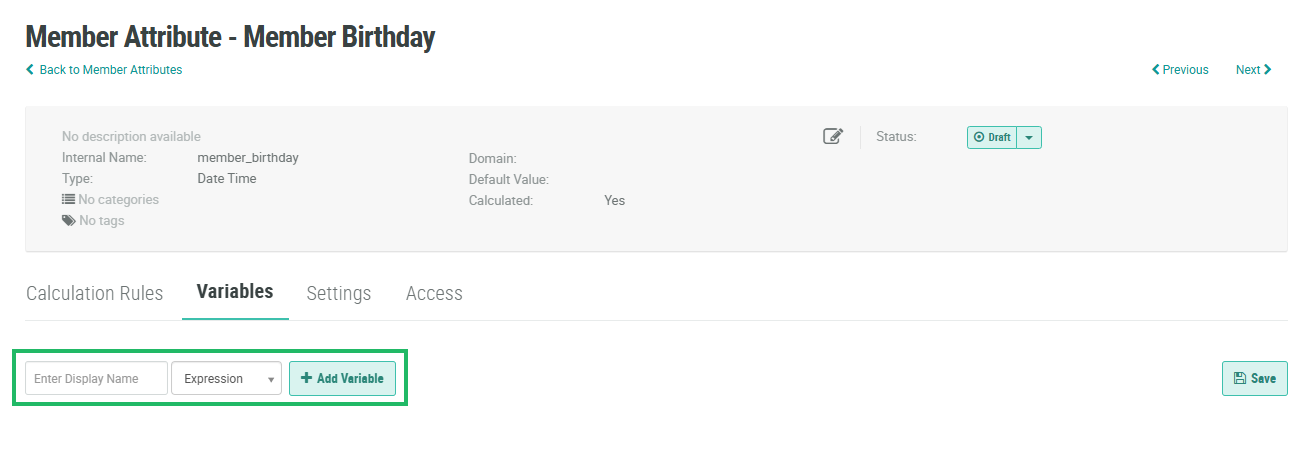 Note: The platform automatically generates an Internal Name based on the Display Name by converting all upper-case letters to lower-case letters, and converting spaces to underscores. The resulting Internal Name will be used as the variable name when defining the Calculated Attribute expression. Once the variable is created, you can't later edit this Internal Name.