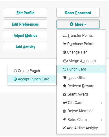 3. Within the header section of the screen, click More > Punch Card > Accept Punch Card. The Accept a Punch Card for a Member pop-up window is displayed.
