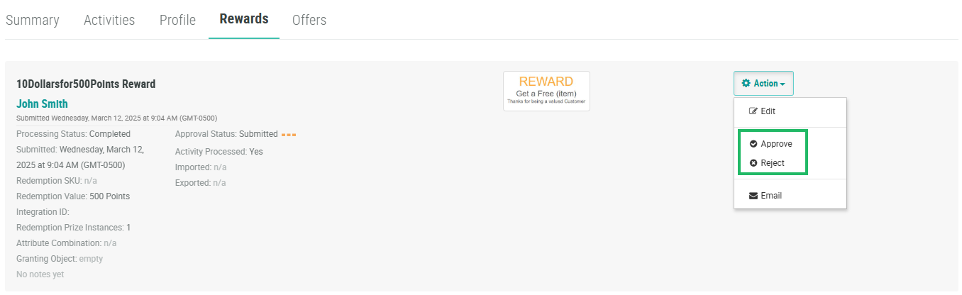 If a Redemption's approval status is still Submitted, you can review the Redemption, then manually approve or reject it from the Member Profile screen.