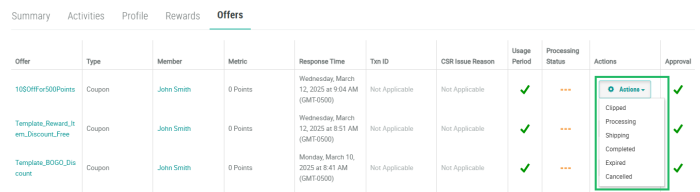 Offer Responses are considered a one-time use object, with their status changing to Completed once they are successfully used. If an Offer has been configured to allow Members to respond more than once, then each response will create a new Offer Response linked to the Member’s Profile, with its own status.