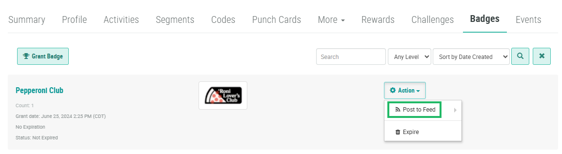 5. Next to the desired Badge, from the Action drop-down menu, select Post to Feed. Select the desired News Feed.