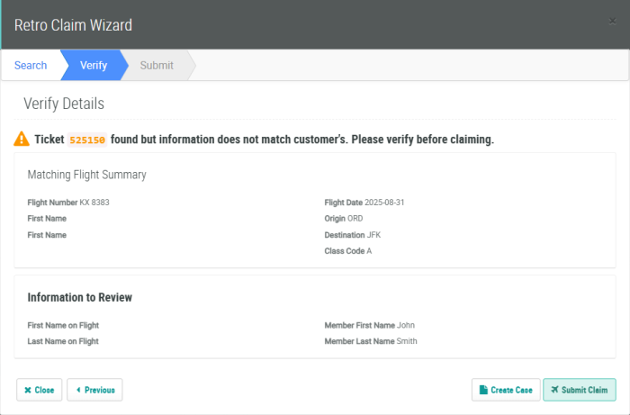 • If the name on the Flight is missing, or does not match the name of the selected Member, a warning message is displayed. Verify that you selected the correct Flight. If not, click Previous to search for a different Ticket Number. If the Flight is correct, click Submit Claim.