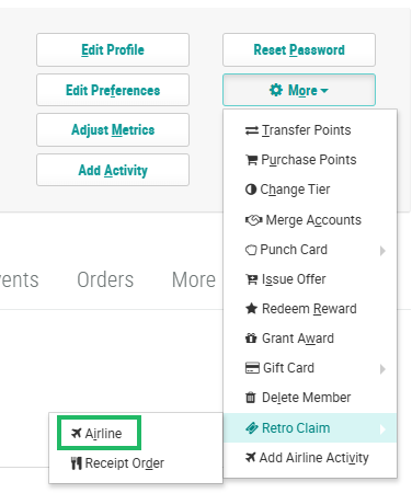 For clients in the airline industry, the Member Profile screen allows Customer Service Representatives to retroactively associate an anonymous Flight with a Member. This process is referred to as a "retro claim," and allows the Member to correctly receive any Metrics or Miles that they should have earned from that Flight.