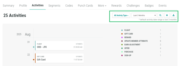 The Activities tab provides a timeline of Member actions, such as signing up for your loyalty program, earning an Offer, making a purchase, redeeming a Reward, and so forth. Within the timeline, the different Activity Types are color-coded. The legend in the top-right corner of the tab indicates the color for each Activity Type, as well as a count.