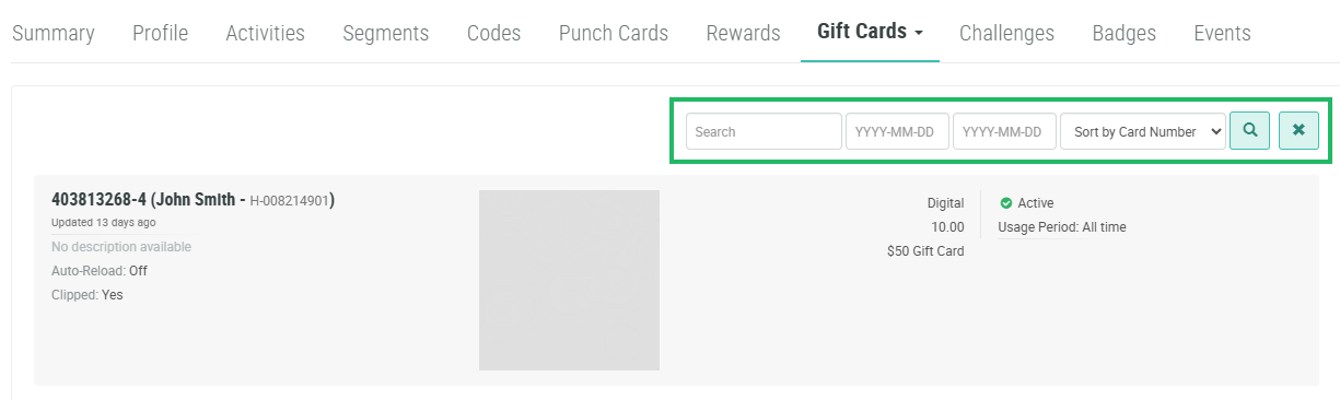 6. Click the Search icon. The screen is refreshed to show only the Gift Cards that meet your search criteria. If you entered multiple search criteria, the Gift Card must meet ALL criteria.