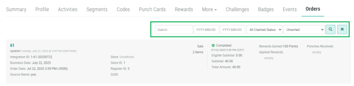 If you click the Order, the platform expands the Order record to show additional details, including the items purchased, returned items, any Offers used, and any punches earned toward a Punch Card.