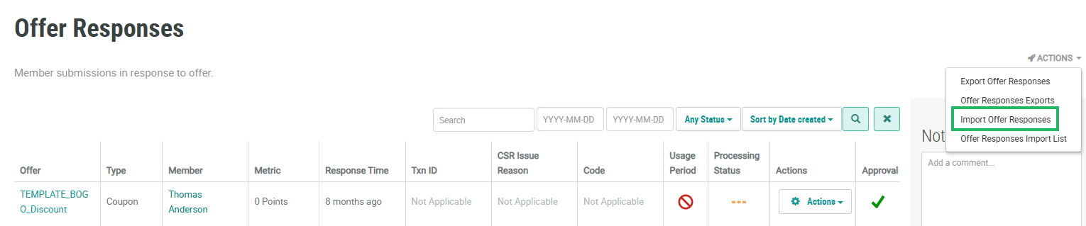 Offer Responses can be created automatically by the Loyalty platform based on information provided from a Point of Sale system when a Member uses an Offer in a purchase. In addition, you can import a file of Offer Responses.