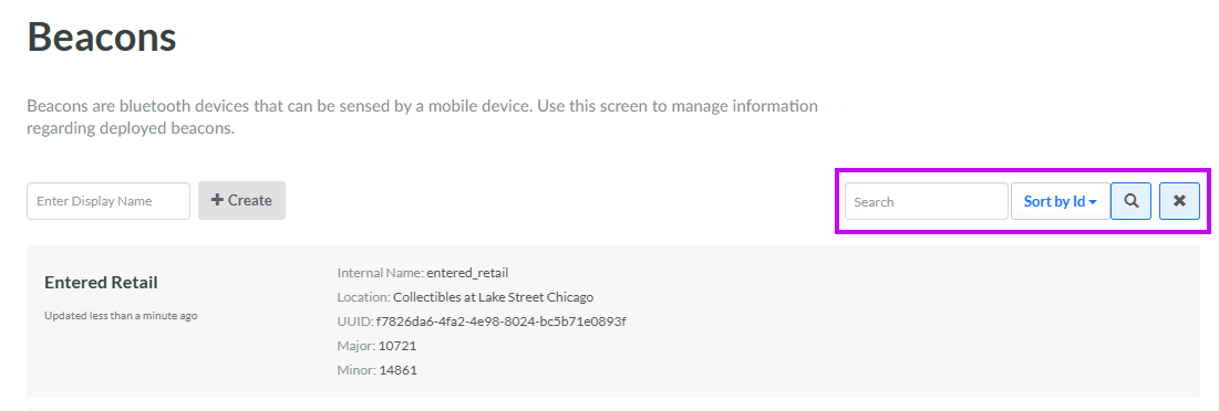 Click the Search icon. The screen is refreshed to show only the Beacons that meet your search criteria. If you entered multiple search criteria, the Beacon must meet ALL criteria.