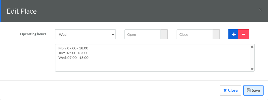 1. Click Edit within the Operating Hours section. The Edit Place pop-up window is displayed.