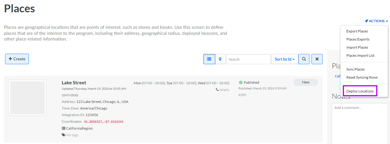 1. From the Actions menu in the top-right corner of the Places screen, select Deploy Locations. A success message is displayed in the bottom-right corner of the screen.