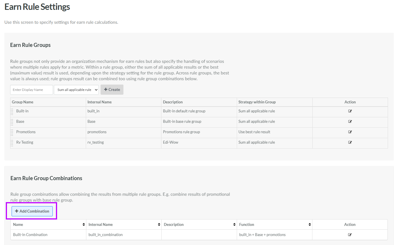 1. Select Rules from the top navigation bar, then select Settings > Earn Rule Settings from the side navigation menu. The Earn Rule Settings screen is displayed.