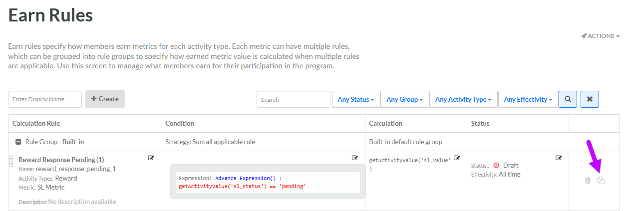 4. Next to desired Earn Rule, click the Copy icon.