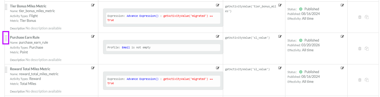 4. To the left of the desired Earn Rule, click and hold on the "handle" area.