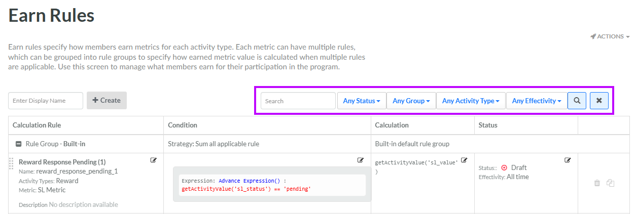 The search feature on the Earn Rules screen allows you to search for a specified text string anywhere within the Display Name and Internal Name. You can also filter the Earn Rules screen based on an Earn Rule's status, assigned Earn Rule Group, Activity Type, and / or status.