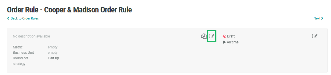 In the header section of the Order Rule Details screen, click the Edit icon. The Edit Order Rule pop-up window is displayed.