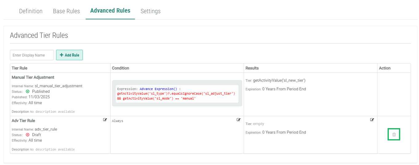 4. Within the Action column of the desired Advanced Tier Rule, click the Delete icon. A confirmation dialog box is displayed; click Confirm.