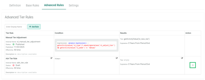 To keep your Loyalty instance uncluttered, the best practice recommendation is to delete unneeded or test Advanced Tier Rules. The deletion process is permanent and irrevocable; you can’t later restore a deleted Advanced Tier Rule.