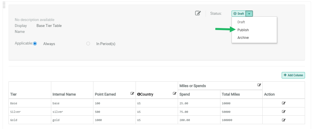 A Tier Table must have a status of Published to be considered live within the Loyalty platform.