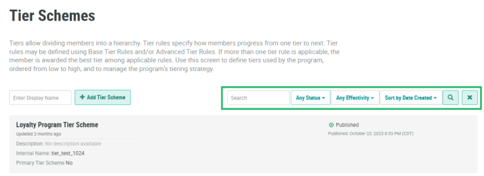 The search feature on the Tier Schemes screen allows you to search for a specified text string anywhere within the Tier Scheme's display name or internal name. You can also filter the Tier Schemes screen to show only Tier Schemes with a specified status or effectivity range.