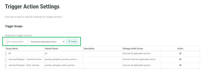 Select Rules from the top navigation bar, then select Settings > Trigger Action Settings from the side navigation menu. The Trigger Action Settings screen is displayed.