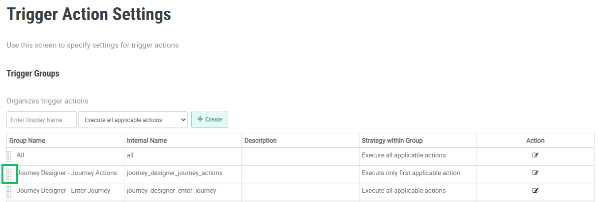 The sequence in which the Trigger Groups appear on the Trigger Action Settings screen controls the sequence in which the platform executes the Trigger Groups. This sequence also controls how the Trigger Groups are displayed on the Triggered Actions screen.