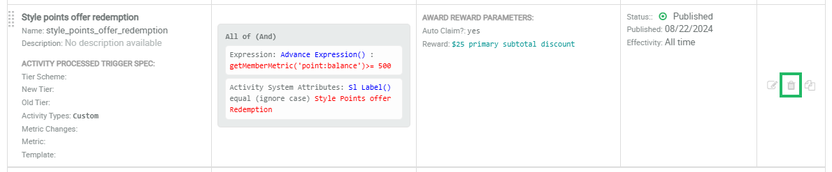 To keep your Loyalty instance uncluttered, the best practice recommendation is to delete unneeded or test Triggered Actions. The deletion process is permanent and irrevocable; you can’t later restore a deleted Triggered Action.