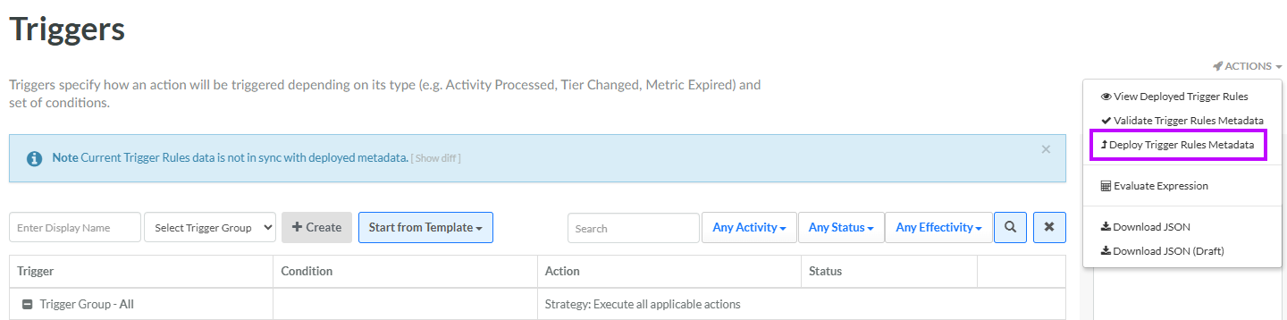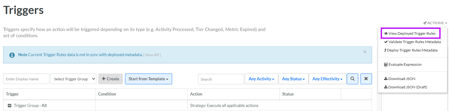 If you validated metadata as described above, within the Validation Result pop-up window, click Deploy Trigger Rules Metadata. Otherwise, from the Actions menu in the top-right corner of the Triggered Actions screen, select Deploy Trigger Rules Metadata. A confirmation dialog box is displayed; click Confirm.