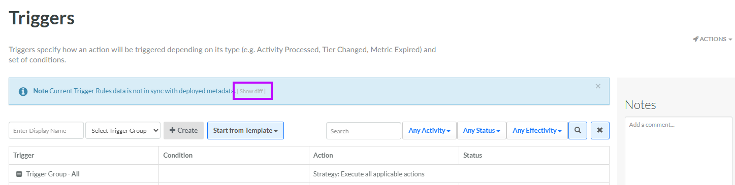 Within the warning message at the top of the Triggered Actions screen, click the Show diff link.