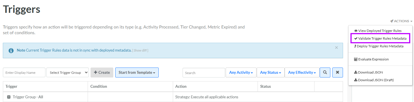 From the Actions menu in the top-right corner of the Triggered Actions screen, select Validate Trigger Rules Metadata.