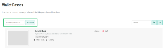The new Wallet Pass, with a status of Draft, is added to the Wallet Passes screen. To configure the new Wallet Pass, click on it to navigate to the Wallet Pass Details screen.