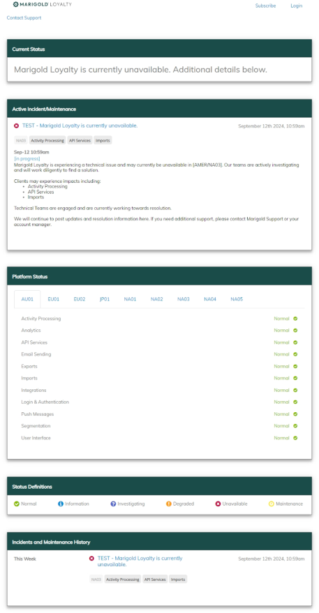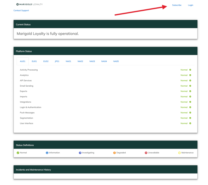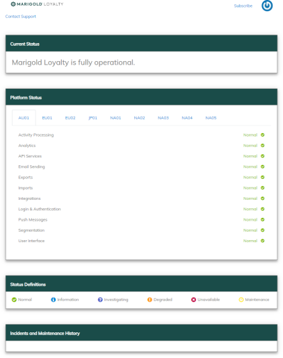 The status page provides you with regular updates regarding the status of the Loyalty platform in the event of a major system incident in your region. In this article we’ll explain the information you will see and how to subscribe to the Loyalty notification system to receive regular updates on the platform status, which we highly recommend to all users.