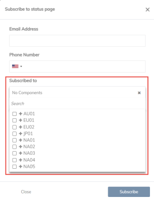 In the next input box you can choose the Components you want to subscribe to. This is the different technical environments in each region. If you are unsure of the name of your technical environment, please contact your Zeta Global CSM, who will be able to provide this information. You can choose 1 or more environments as required.