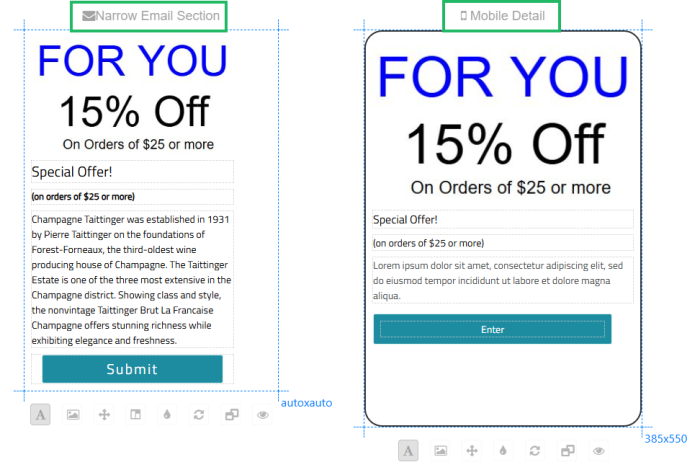 The following example shows two Layouts: Narrow Email Section and Mobile Detail. The Layouts have slightly different sizes and configurations, depending on the context of where the content is displayed to the Member.
