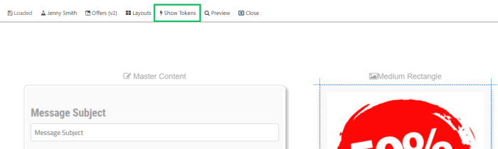 Optionally, to make it easier to differentiate Content Tokens from regular text, you can toggle on the Show Tokens feature, which highlights all of the Content Tokens in yellow. To toggle this feature on, within the Menu Bar, click the Show Tokens icon.