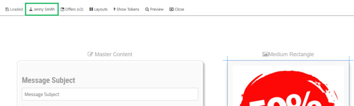 For testing purposes, the platform will automatically populate Content Tokens in the Content Editor with values pulled from the Member Profile of a selected Test Member. The currently selected Test Member is displayed within the Menu Bar at the top of the Content Editor screen.