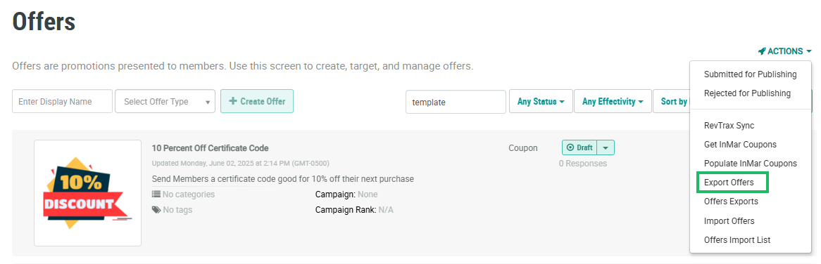 Select Campaigns from the top navigation bar, then select Offers > Offers from the side navigation menu. The Offers screen is displayed.