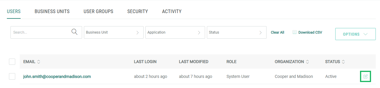 Select the App Access tab. This tab displays all the Business Units and applications to which this user has been assigned.
