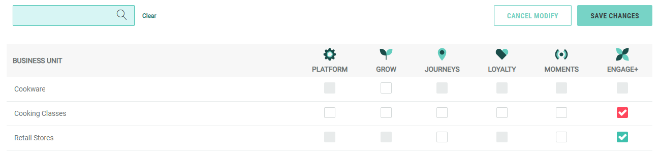Click Modify Access. The platform displays a grid of Business Units by application.