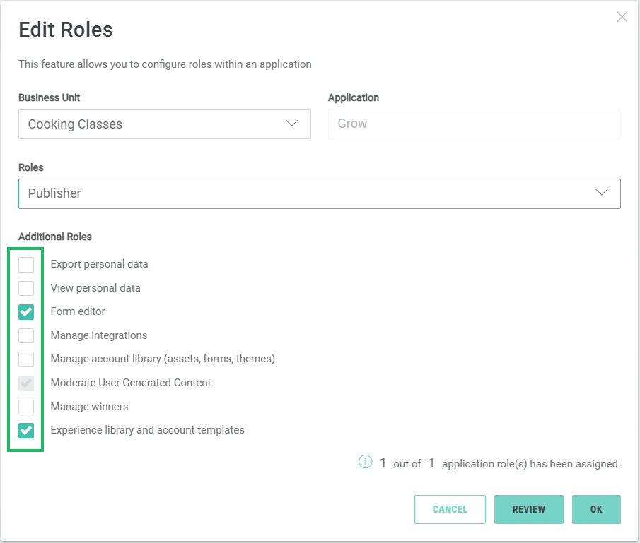 Optionally click Review to see a summary of the user’s selected Role assignment.