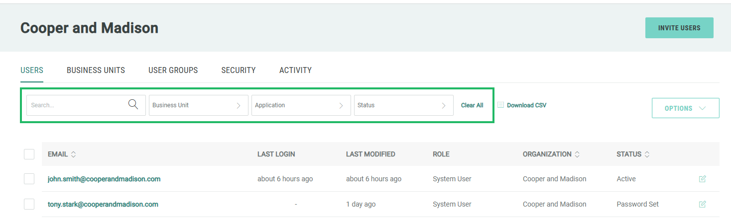 The Zeta Login Administration environment provides administrators with a convenient list of users. Business Unit Administrators will see all users across all Business Units they administer. Organization Administrators will see all users across the entire Organization.